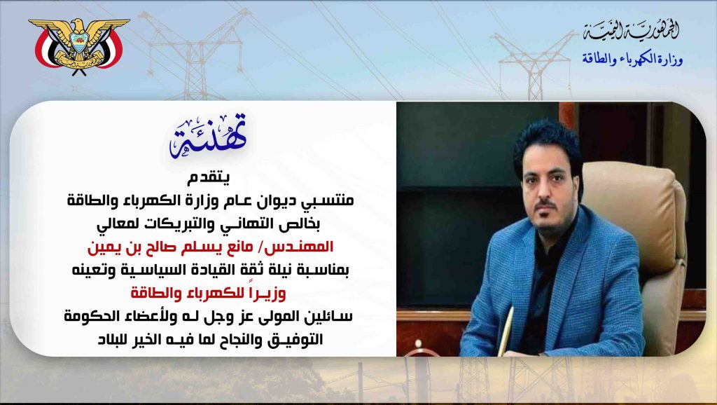 قيادة ومنتسبي ديوان عام وزارة الكهرباء والطاقة يباركون تعيين المهندس / مانع بن يمين وزيراً للكهرباء والطاقة