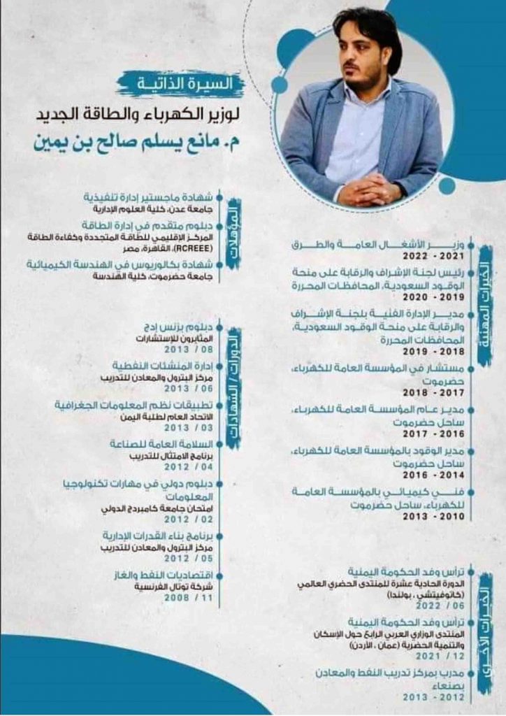 صدور القرار الجمهوري رقم (17) لسنة 2022م بتعيين المهندس مانع يسلم بن يمين وزيراً للكهرباء والطاقة
